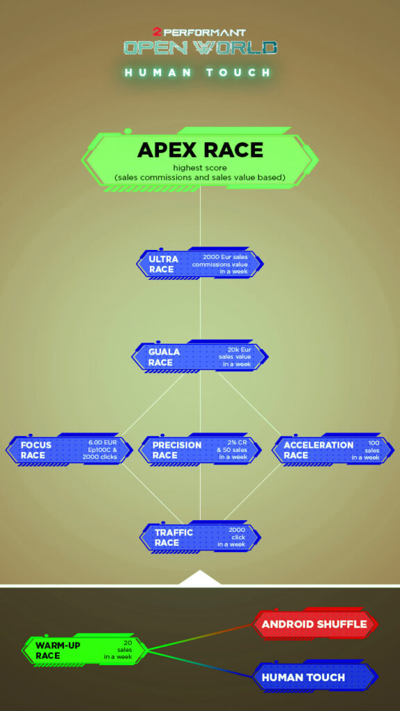 Odată intrați în Open World, afiliați vor avea de parcurs, exact ca într-un joc virtual, mai multe etape, mai multe provocări săptămânale de marketing numite „curse”. Acestea au un nivel crescător de dificultate și pentru a accesa nivelul următor, utilizatorul trebuie să termine cursele anterioare. Afiliații vor întâlni în Open World o serie de personaje fictive, care vor stabili noi provocări săptămânale. Toate vor culmina cu APEX, cursa supremă de marketing afiliat în Open World, unde cei mai buni jucători vor concura pentru marele premiu de 15.000 de euro.