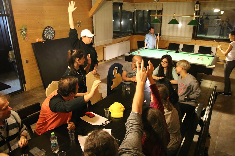 În fiecare seară e program de voie bună, iar după cină ne retragem în foișorul de la Family Hotel Arnica*** în jurul meselor de biliard, foosball, tenis de masa și air hockey. În unele seri, o mare parte dintre noi ne-a adunat la jocuri precum Mafia sau am încercat boardgame-ul despre PPC al lui Ionuț Munteanu.