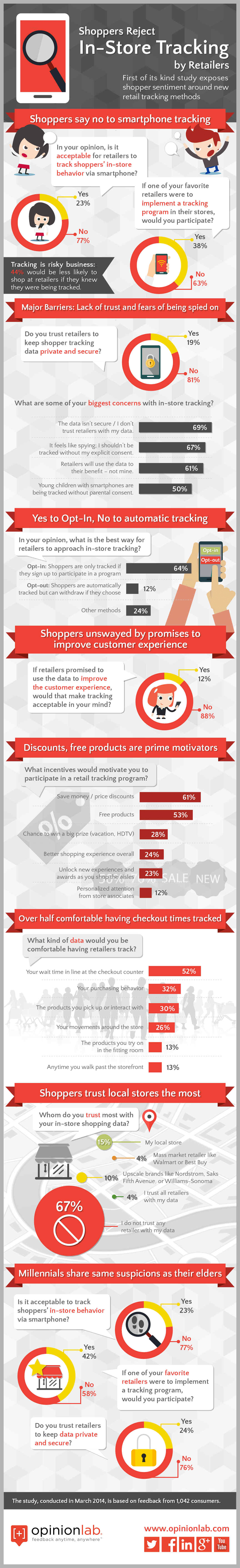 „In-store tracking” nu pare a fi o practica acceptabila din punctul de vedere al clientilor, daca este sa ne luam dupa studiul realizat de OpinionLab in luna martie 2014 pe un esantion de 1042 de consumatori din SUA. 77% dintre clientii care au participat la studiu au vazut tracking-ul in magazin ca fiind o invadare a intimitatii.