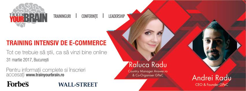 TrainYourBrain și GPeC vă invită la Trainingul Intensiv de E-Commerce de 1 zi organizat pe 31 martie 2017 în București. Evenimentul se desfășoară la Grand Hotel Continental, Calea Victoriei nr. 56, în data de 31 martie 2017, între orele 10:00 și 17.00. Trainingul își propune să condenseze într-o singură zi toate informațiile care să vă ajute să înțelegeți de ce aveți nevoie pentru a vă deschide un magazin online sau pentru a vinde mai mult. Trainingul va fi susținut de Andrei Radu (CEO & Founder GPeC și Co-Founder TRUSTED.ro) și Raluca Radu (Country Manager Answear.ro și Owner MTH Digital).